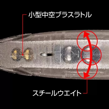 El puntal trasero genera vibraciones y turbulencias irresistibles; el sonajero interno de latón y acero produce una mezcla única de tonos agudos y graves; y el anzuelo trasero con oropel añade un brillo chispeante y un movimiento giratorio que despierta la curiosidad del bass hasta hacerlo subir a atacar.