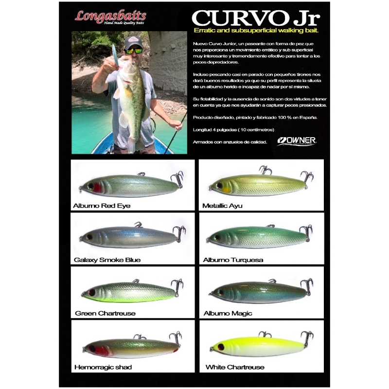 Con una longitud de 4 pulgadas (10 cm), el Curvo Junior es perfecto para atraer a peces de diferentes tamaños, especialmente a los más grandes, que son los que responden mejor a los señuelos más grandes y detallados.