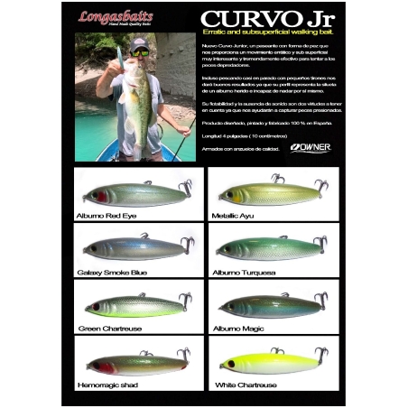 Con una longitud de 4 pulgadas (10 cm), el Curvo Junior es perfecto para atraer a peces de diferentes tamaños, especialmente a los más grandes, que son los que responden mejor a los señuelos más grandes y detallados.