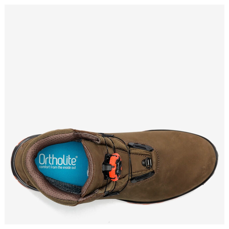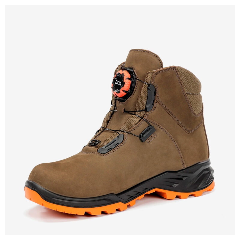 Fabricada en piel nobuck de alta calidad, combina resistencia y elegancia con la máxima protección frente a la humedad. Incorpora el BOA® Fit System, un innovador sistema de ajuste rápido y preciso que permite una sujeción perfecta del pie con un simple giro, aportando comodidad y estabilidad durante toda la jornada.