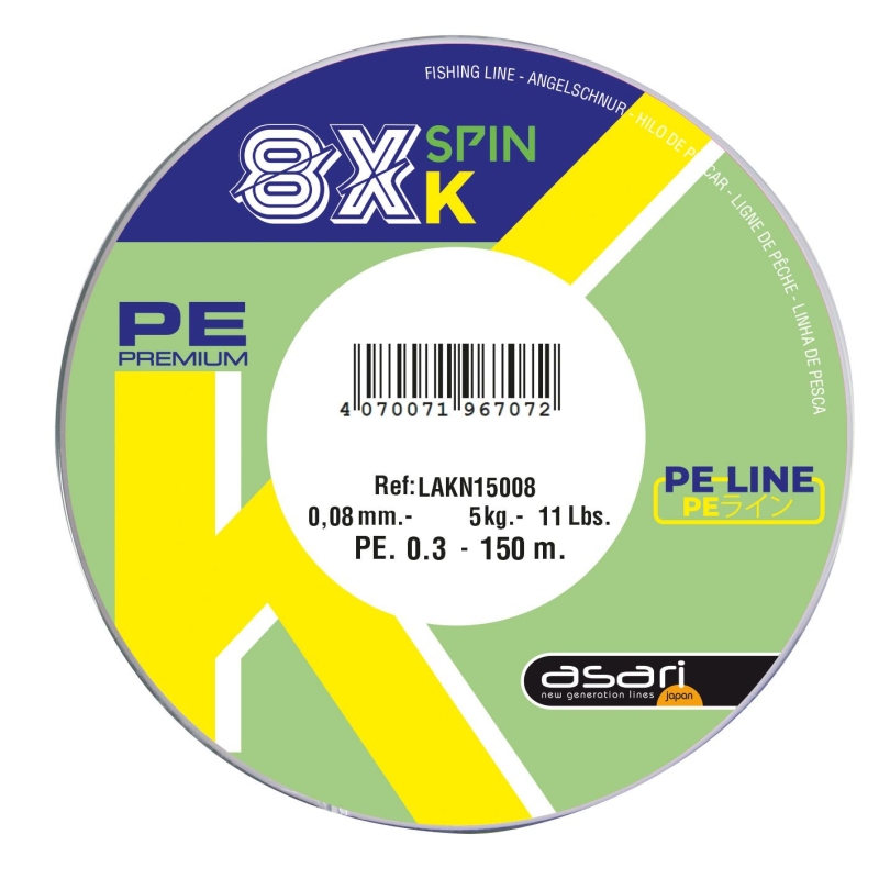 El Asari 8X-K Spin es un trenzado de 8 hebras (PE 8X) de alta calidad, diseñado especialmente para los pescadores que buscan rendimiento, precisión y control absoluto en cada lance. Su color amarillo fluo garantiza una visibilidad total, ideal para detectar hasta las picadas más sutiles y mantener el control del hilo en todo momento, tanto en agua dulce como en mar.