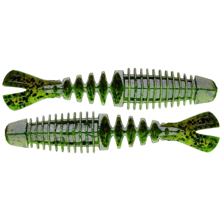 El nuevo Happy Trailer de Googan Baits ofrece un diseño de vanguardia para proporcionar un nivel inigualable de versatilidad en el agua . El perfil aerodinámico en forma de diamante refleja el pez carnada, lo que permite que el Happy Trailer se mueva a través de una cubierta pesada sin problemas. Las nervaduras profundas en la primera mitad del cuerpo generan un inmenso desplazamiento de agua que permite a los peces atrapar el cebo. La sección media del cuerpo tiene un diseño único de estilo acordeón que permite 360 grados de movimiento y acción omnidireccional. Además, la cola de doble corte permite utilizar más peso para crear una acción de natación errática y contundente. La aleta de cola presenta una hendidura marcada y socavada que permite que la cola desvíe el agua e imite una acción de natación natural.