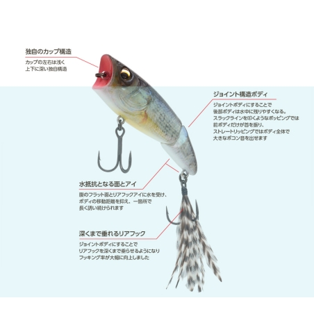 Gracias a su posición de flotación vertical y a su copa profunda, el MJ POP genera un “BOCON” grave y potente, ideal para llamar a los bass desde zonas profundas o con mayor columna de agua.