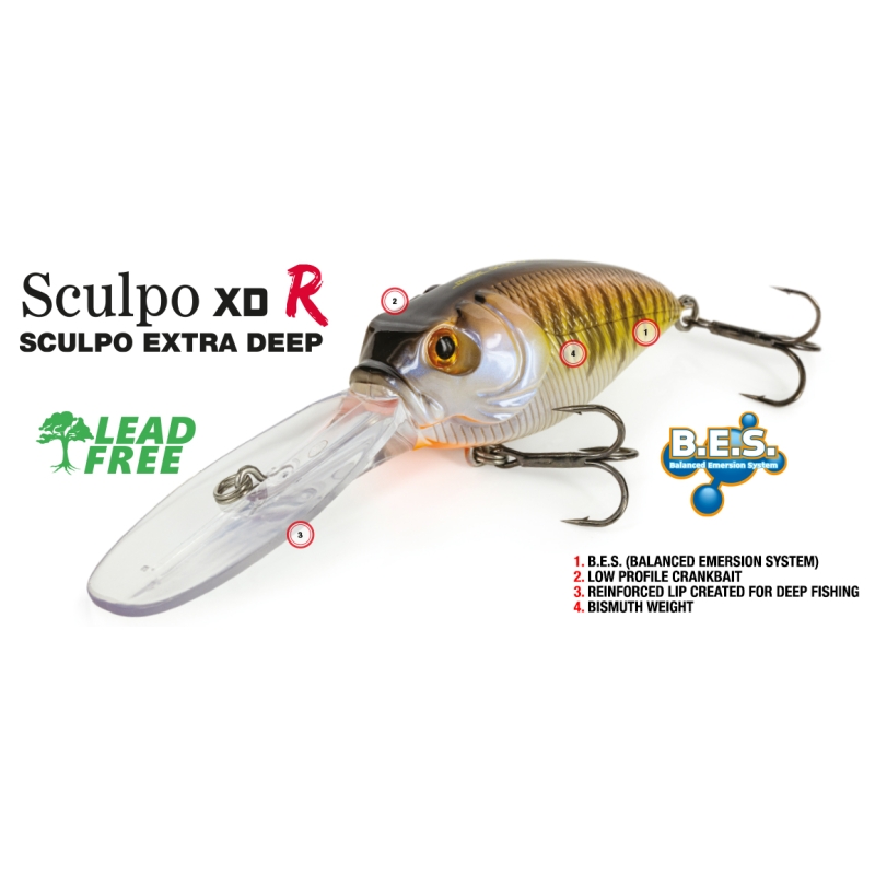 El SCULPO XD R ha sido diseñado específicamente para dominar la pesca en profundidad. Un crankbait innovador que combina ingeniería avanzada, equilibrio perfecto y una acción capaz de provocar a los Big Bass más apáticos.